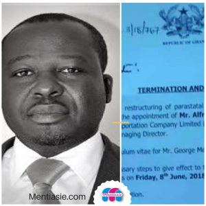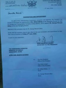 The Managing Director of the Bulk Oil Storage and Transport Company, Alfred Obeng Boateng, has been sacked.
